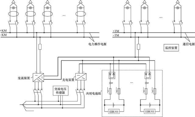 基于上述剖析,結(jié)合現(xiàn)在變電站直流屏電源體系的實踐運轉(zhuǎn)情況,筆者以為針對傳統(tǒng)直流屏電源體系進行優(yōu)化整合對錯常有含義的?,F(xiàn)提出一種將操作電源和通訊電源共用電池組的混合型直流屏電源體系處理辦法,該體系計劃主要由監(jiān)控設(shè)備、充電設(shè)備、變流設(shè)備、N個串聯(lián)電池組和饋電回路等構(gòu)成。