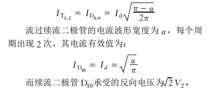 加了續(xù)流二極管后其輸出電壓波形V3與不加續(xù)流二極管時相同。原先流經(jīng)橋臂上元件的續(xù)流電流變成經(jīng)過二極管續(xù)流。各原件中流過的電流波形和變壓器副邊電流波形顯著有必定的間隔。每個周期中流過晶閘管T1、T2、D8、D9的電流波形寬度都是π—α,其電流有效值為(Id為負(fù)載電流)