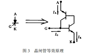 晶閘管的結(jié)構(gòu)相當(dāng)于串級雙晶體管模型P一N一P一N4層結(jié)構(gòu),因而具有3個PN結(jié),別離引出陽極A,陰極K,門極G。在圖3結(jié)構(gòu)里不管在PNP和NPN晶體管的A一K端點(diǎn)施加正向電壓仍是反向電壓,其中的P一N一P一N結(jié)構(gòu)都處于高阻阻斷狀況,只經(jīng)過很小正向漏電流或很小的反向漏電流,與一般二極管的反向特性類似。一旦門極電流Ic注入G點(diǎn),就會因為形成激烈的正反饋導(dǎo)致PNP和NPN進(jìn)入完全飽滿狀況,即晶閘管飽滿導(dǎo)通。
