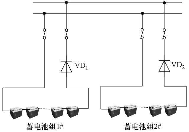 在外部溝通供電異常時,蓄電池組由銜接在直流屏正極與蓄電池組正極之間的大功率二極管VD1/VD2無縫對負(fù)載進(jìn)行供電。放電通道并聯(lián)等效電路如圖4所示。在電池組并聯(lián)時,即使兩組電池存在電壓差,高電壓蓄電池組與低電壓蓄電池組之間也不導(dǎo)通,不存在充電回路,故防止了環(huán)流現(xiàn)象的發(fā)生。