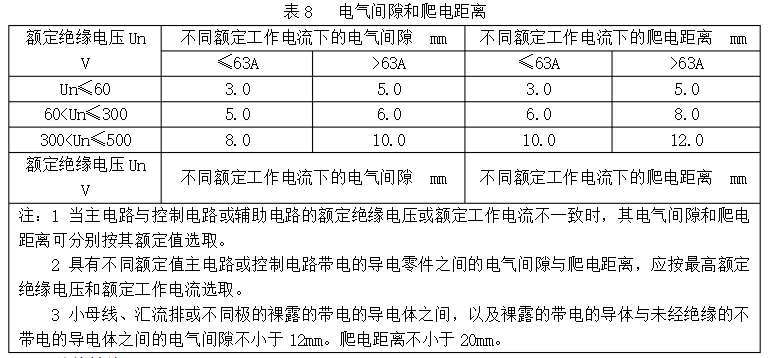 直流屏設(shè)備內(nèi)兩帶電導(dǎo)體之間,以及帶電導(dǎo)體與暴露的不帶電導(dǎo)體之間的最小間隔,均應(yīng)符合表8規(guī)定的最小電氣空隙與爬電間隔的要求。
